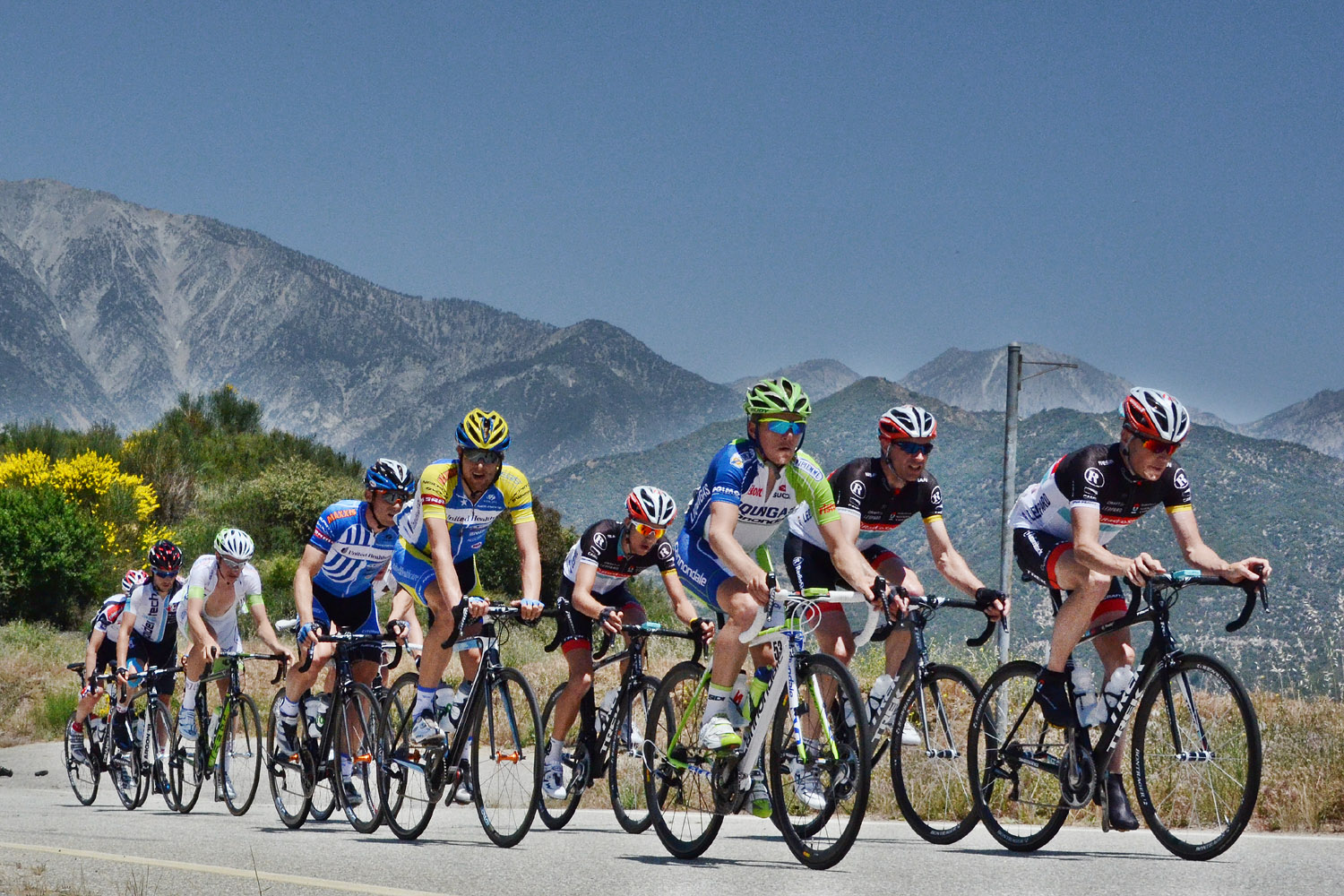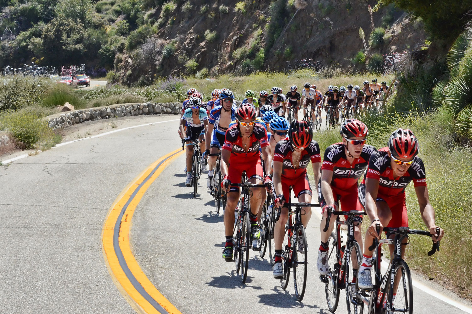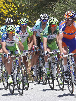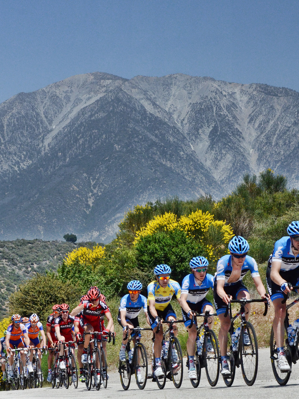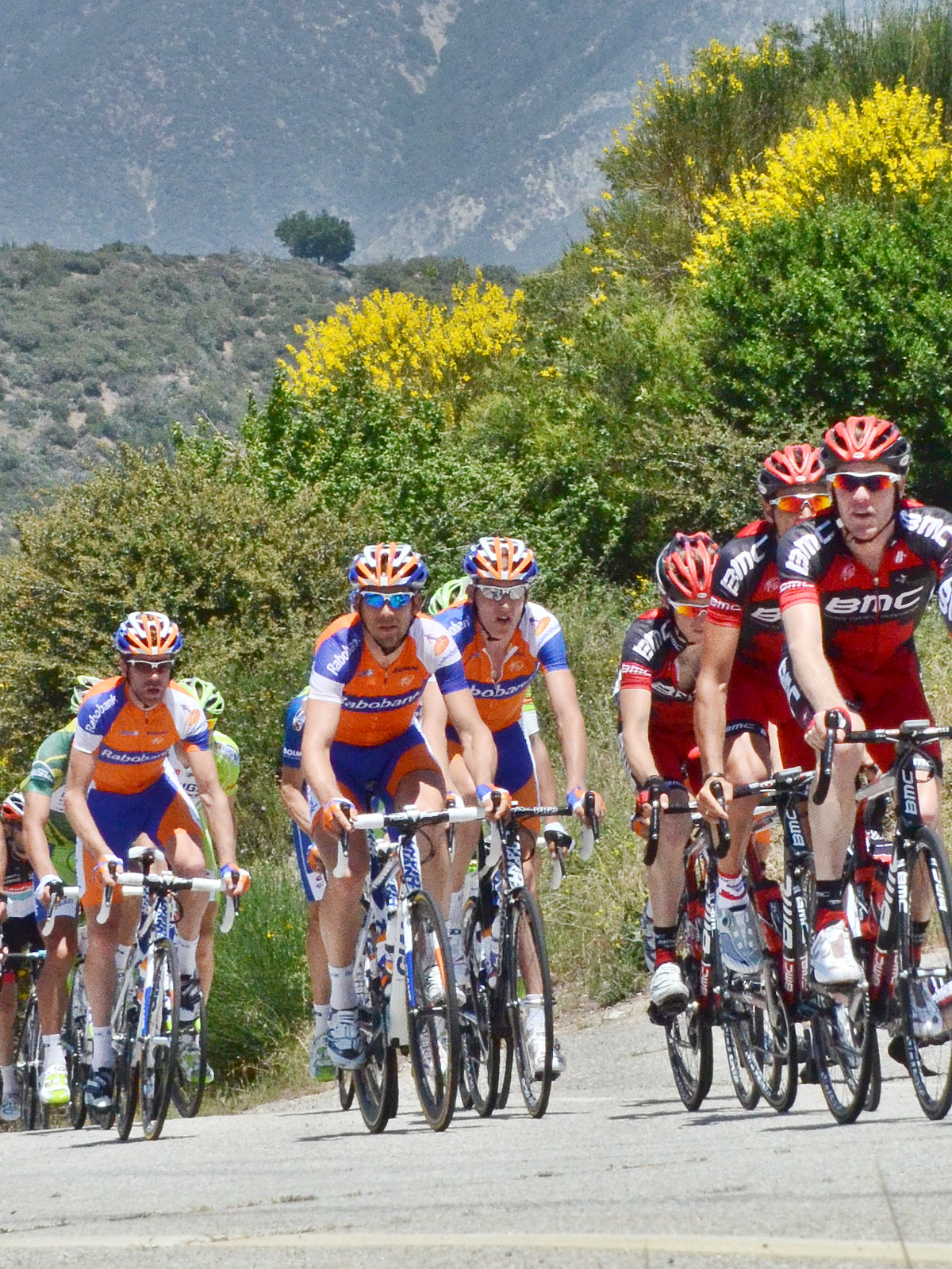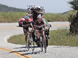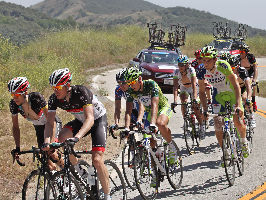 Annette and I spent most of the day on Saturday May 19th up on the mountian photographing Stage 7 of the AMGEN Tour of California. The stage route was similar to that of 2011, except that it started in Ontario and like last year, it ended at the Mount Baldy ski lifts. The route took the riders up the Baldy Road to Baldy Village and along the Glendora Ridge Road (GRR) to Glendora Mountain Road (GMR). They followed GMR down into the East Fork of San Gabriel Canyon and continued west to Highway 39 and then down the San Gabriel Canyon into Azusa. A left turn put them eastbound on Sierra Madre Ave which took them over to the base of GMR where they turned north to head back into the mountains. The ride up GMR brought them back to GRR and then back to Baldy Village. They continued on through Baldy Village on their way up to the ski lifts - the steepest part of the stage. Our day on the mountain began at 8:00 AM when we left home, Annette on her bike accompanied by one of our riding friends, Matt and I driving the SAG vehicle with supplies of food, beverages, and various emergency supplies. I parked the car near a road manintenace shed which is about 8.5 miles up GMR and awaited the arrival of Annette and Matt. I had my bike on the car so that we could ride to the spots where we wanted to shoot our pictures from. We shot the race at two points, the first one was about two miles east of the GMR/GRR fork where we caught the riders heading west outboud from Baldy. Then, after all of the riders and the fleet of supprort vehicles had gone by, we rode back over to the shed on GMR which is about 1 mile west of the GMR/GRR fork and caught the riders as they climbed up the final road segment which leads to the shed. |