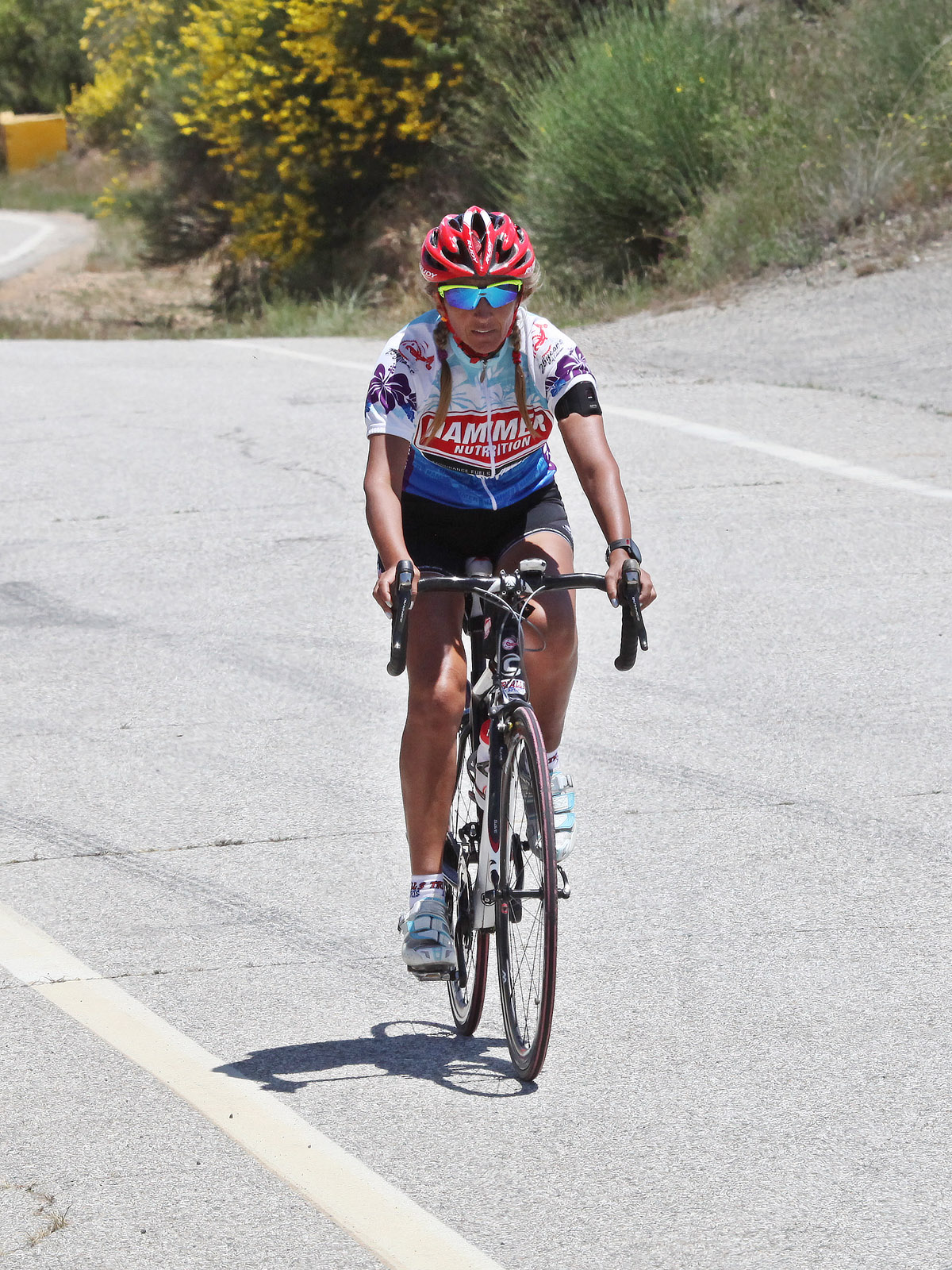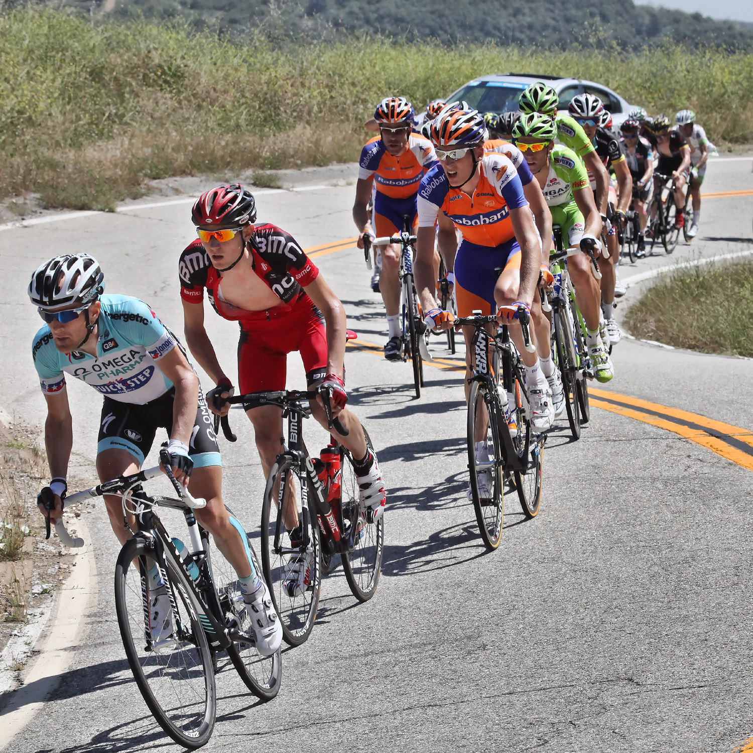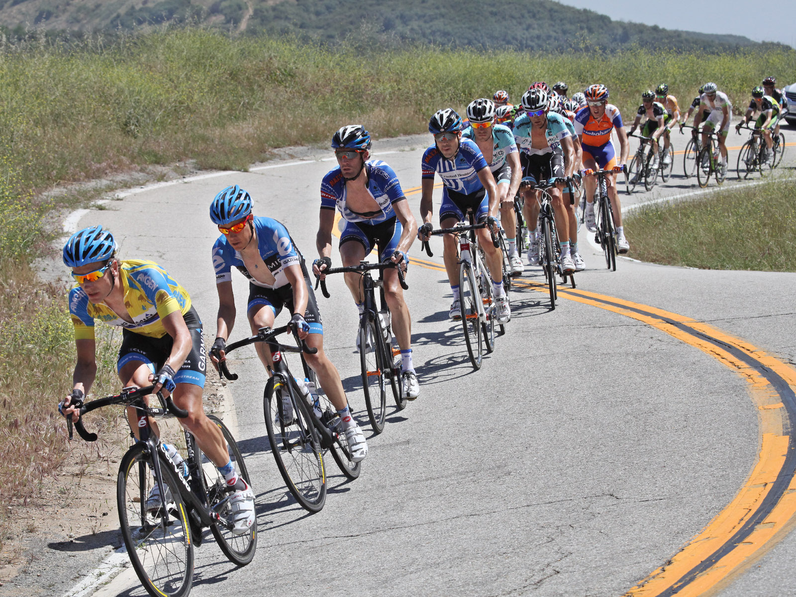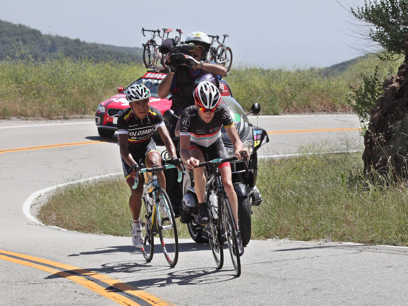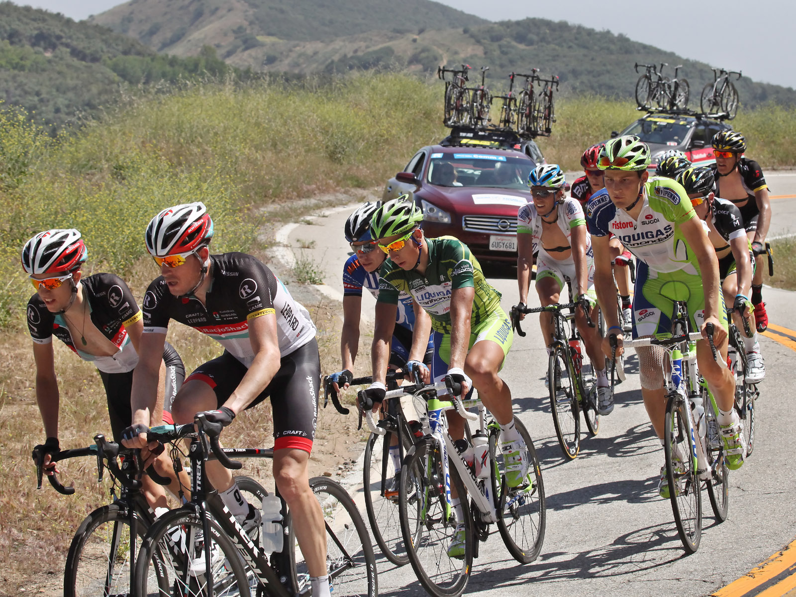 Annette and I spent most of the day on Saturday May 19th up on the mountian photographing Stage 7 of the AMGEN Tour of California. The stage route was similar to that of 2011, except that it started in Ontario and like last year, it ended at the Mount Baldy ski lifts. The route took the riders up the Baldy Road to Baldy Village and along the Glendora Ridge Road (GRR) to Glendora Mountain Road (GMR). They followed GMR down into the East Fork of San Gabriel Canyon and continued west to Highway 39 and then down the San Gabriel Canyon into Azusa. A left turn put them eastbound on Sierra Madre Ave which took them over to the base of GMR where they turned north to head back into the mountains. The ride up GMR brought them back to GRR and then back to Baldy Village. They continued on through Baldy Village on their way up to the ski lifts - the steepest part of the stage. Our day on the mountain began at 8:00 AM when we left home, Annette on her bike accompanied by one of our riding friends, Matt and I driving the SAG vehicle with supplies of food, beverages, and various emergency supplies. I parked the car near a road manintenace shed which is about 8.5 miles up GMR and awaited the arrival of Annette and Matt. I had my bike on the car so that we could ride to the spots where we wanted to shoot our pictures from. We shot the race at two points, the first one was about two miles east of the GMR/GRR fork where we caught the riders heading west outboud from Baldy. Then, after all of the riders and the fleet of supprort vehicles had gone by, we rode back over to the shed on GMR which is about 1 mile west of the GMR/GRR fork and caught the riders as they climbed up the final road segment which leads to the shed. |